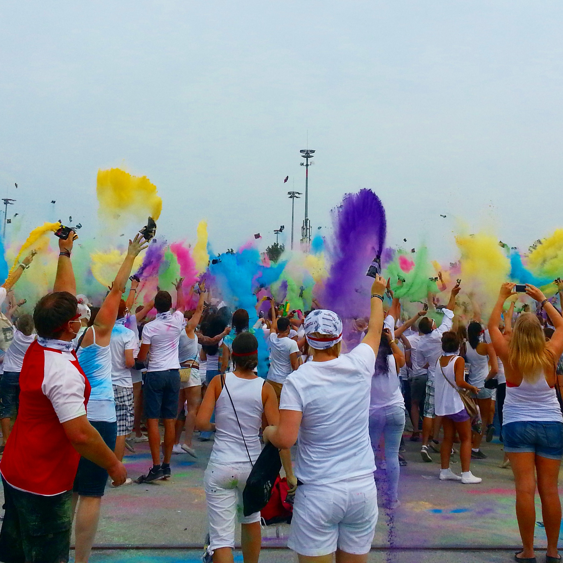 Von außerhalb sah das traumhaft aus, wenn man allerdings mittendrin stand, war es schnell vorbei mit der kunterbunten Idylle. Hier hatte es eher was von exlopdiertem Mehllager. Staubige Sicht, schlechte Atemluft, aber irrerweise dennoch viel Spaß. Das ist wohl die Gruppendynamik, denn wenn um einen herum alles vor Glück jauchzt und quietscht, ist es schwer, nicht auch fröhlich zu sein.