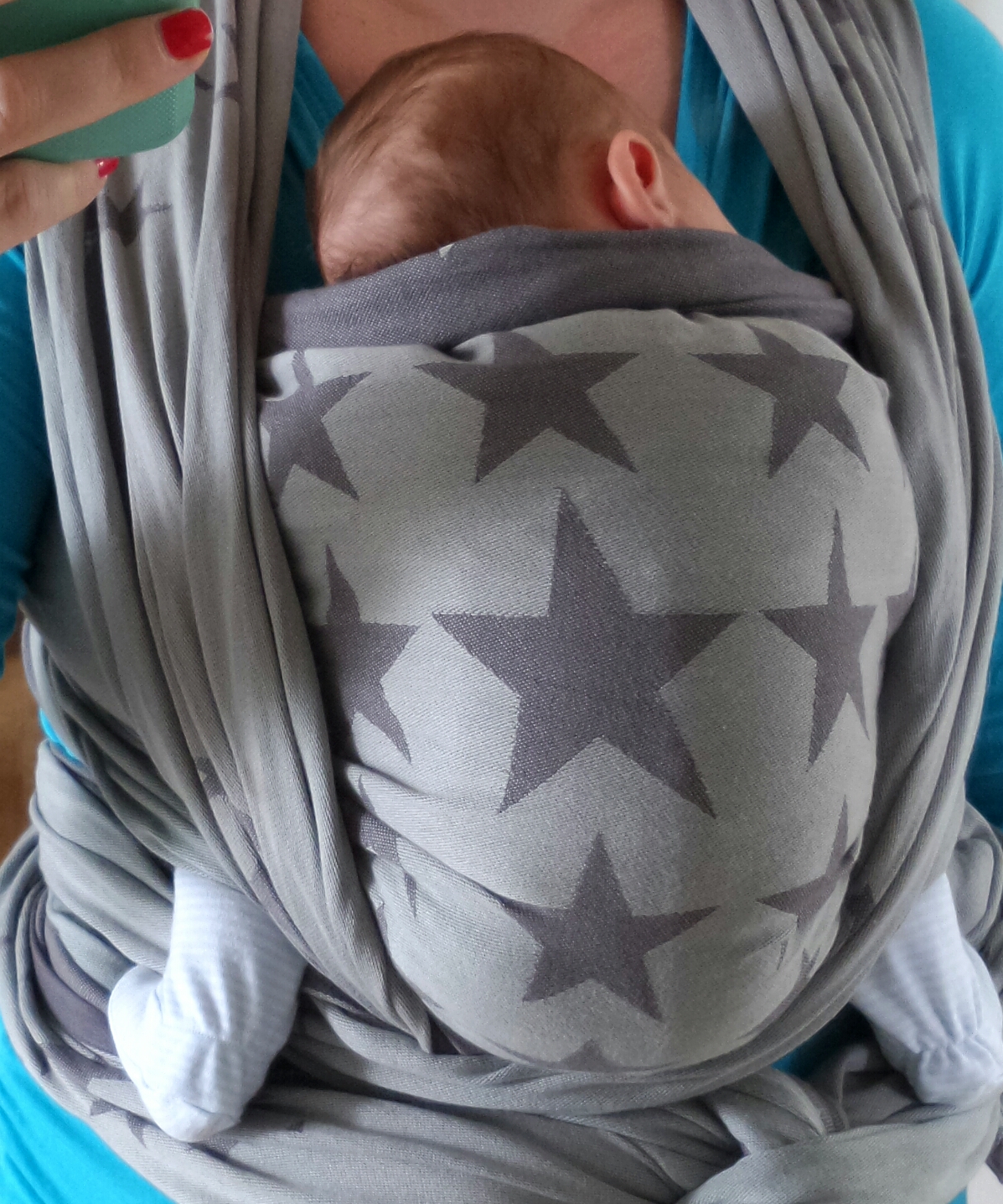 Und dann geht’s los. Katharina zeigt mir die Wickelkreuztrage. Die eignet sich schon ab Geburt und ist die Bindeweise, die ich auch mit Erbschen meistens binde. Es ist echt erleuchtend zu sehen, wie man das Tuch fest bindet und gut nachzieht, woran ich merken kann, ob das Tuch zu fest ist, oder irgendwo einschneidet und wie ich die Beinchen richtig anhocke (wichtig für die Hüftreifung) und den Rücken schön runde. Ich binde zwei Mal mit einer Tragepuppe nach – die ziemlich schwer ist – und dann schnapp ich mir das schlafende Erbschen. Ich bin etwas aufgeregt, Katharina erinnert mich an ein paar Handgriffe und schon ist der Zwerg sicher und kuschelig eingebunden. Ein tolles Gefühl. Alles weitere ist Übungssache und ich freu mich drauf, Erbschen jetzt täglich zu tragen und ihm ein sicheres, geborgenes Gefühl und mir Nähe zu meinem kleinen Lieblingsmenschen zu schenken.